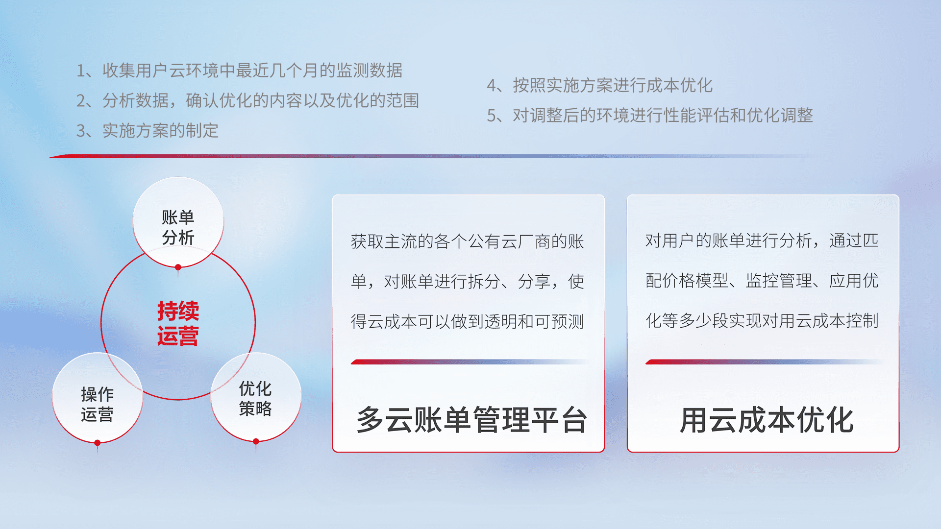 通过多云纳管,,,以统一的资源数据模型把客户的云资源进行抽象和封装,,,,进而实现对多云资源的统一操作,,,,保障云资源管理的可靠性、、、、稳定性与可用性。。。。量身定制化运维内容,,,,配置、、、开发运维、、、、补丁管理、、、、备份、、监控、、认证和访问管理、、、、审计和日常巡检等,,保障在用云过程中的可靠度,,稳定度以及高可用率。。。。