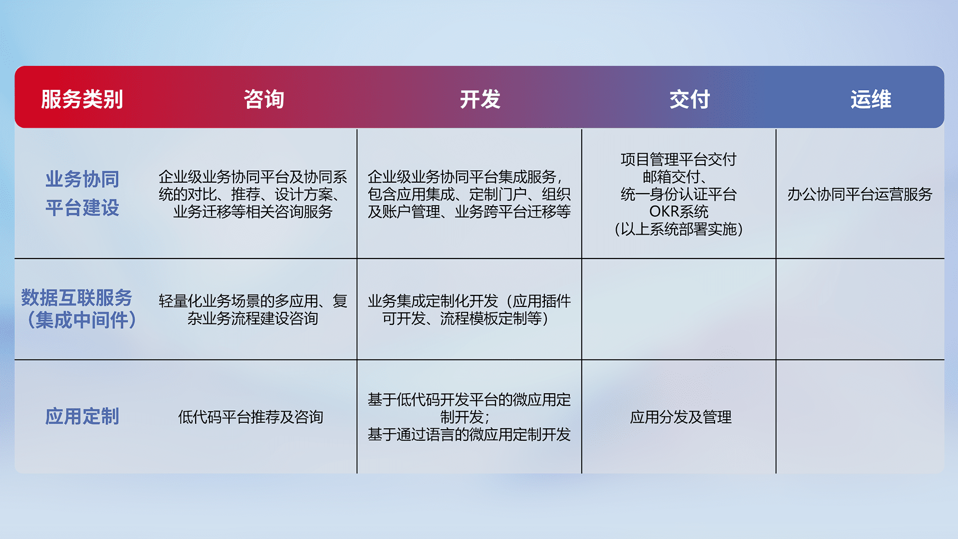 针对钉钉、、、、企微、、、IDaas等平台级产品提供产品的规划、、、方案、、、、交付、、、定制化开发等服务,,,,实现如统一协同办公、、、智能客户服务、、、混合会议管理、、、智能数据查询、、、等业务场景,,实现数字化转型。。。。